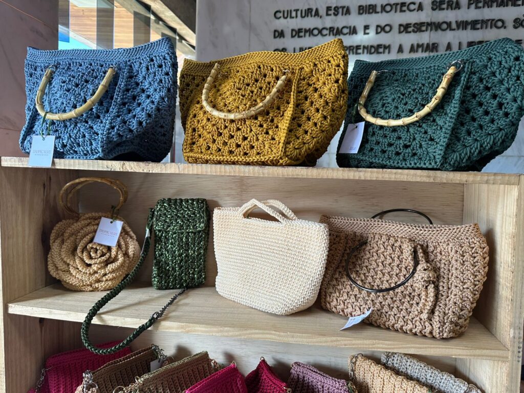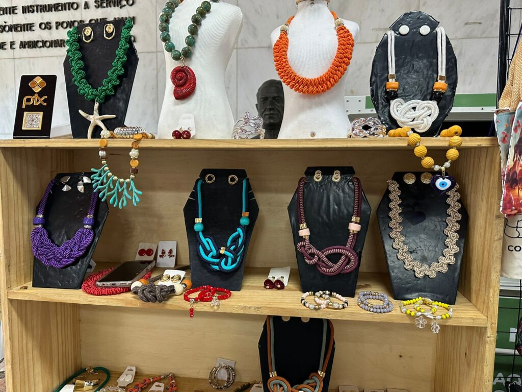 Expositores e expositoras locais mostram a potência da economia criativa com artesanatos feitos com matérias-primas oriundas de diversas regiões do estado, fortalecendo diversas cadeias produtivas e distribuindo renda. Uma das expositoras é a Jôsi Viviana (@vivianasisal), que confecciona à mão artefatos com sisal, uma fibra natural vinda de Valente, na Bahia, e juta da Amazônia.