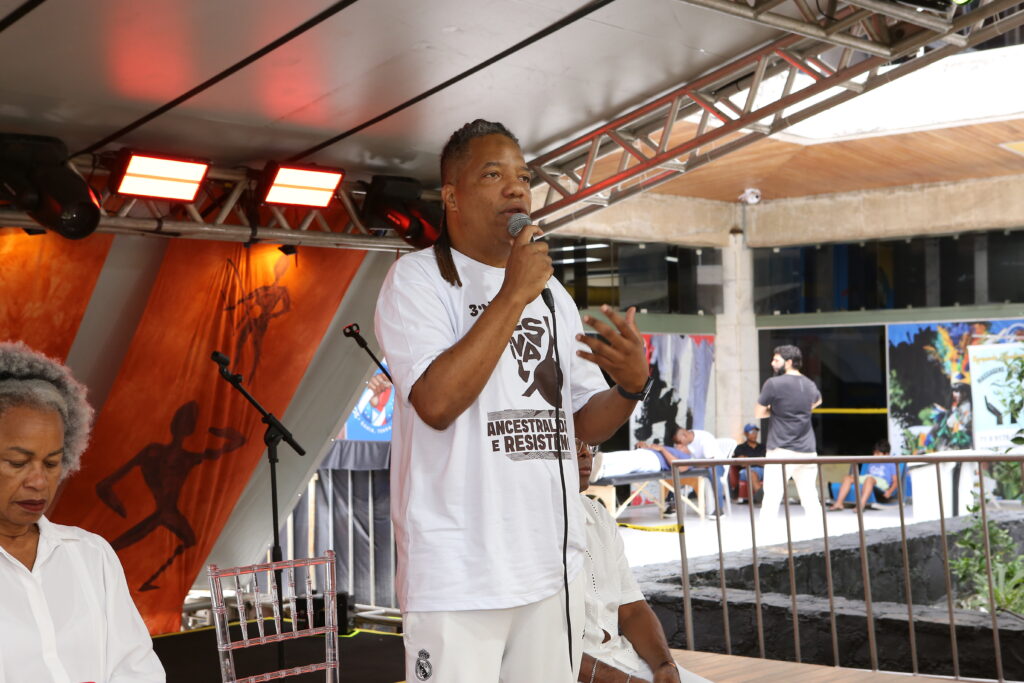 “Ano passado foi regulamentada a lei Moa do Katendê, que é um plano de salvaguarda da Capoeira, mas que prevê, entre outras coisas, a inclusão da capoeira nas escolas públicas do Estado da Bahia. E esse ano começou a sua implementação. Muitos aqui podem dizer: ‘poxa, mas a capoeira já está na escola, na minha comunidade’. O fundamental aqui é entender que nós não queremos entrar pelas portas dos fundos, nós não queremos aquele cantinho da sala de aula. A gente quer ter um espaço com dignidade. Nós queremos que o nossos Mestres e Mestras sejam reconhecidos como guardiões e guardiãs dessa ancestralidade. A segunda questão é que: a capoeira nas escolas, para nós, não é meramente uma atividade física. É, sobretudo, conhecimento. Para preservar e entendermos a nossa cultura, para garantir que o nosso povo tenha identidade cultural vinculada à sua história e formação”.